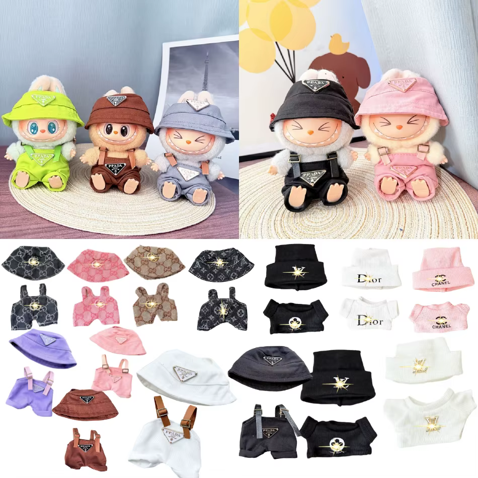 Accessories for 17cm Labubu Dolls Sitting Party Series T-shirt and Hat with Jumpsuit and Plush Doll Outfit